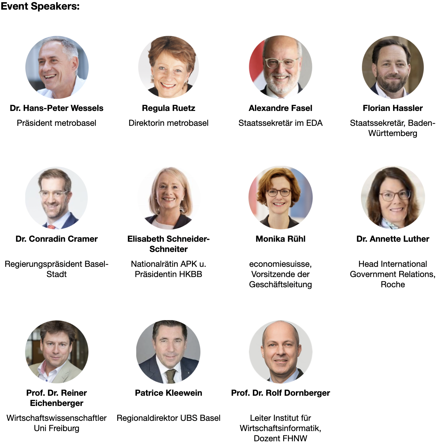 Mit Monika Rühl, Direktorin economiesuisse, Dr. Annette Luther, Head International Government Relations at Roche, Prof. Dr. Reiner Eichenberger, Wirtschaftswissenschafter Universität Freiburg und Elisabeth Schneider-Schneiter, Nationalrätin Aussenpolitische Kommission u. Präsidentin der Handelskammer beider Basel, haben weitere hochkarätige Referentinnen ihre Zusage für den metrobasel Sommeranlass gegeben.